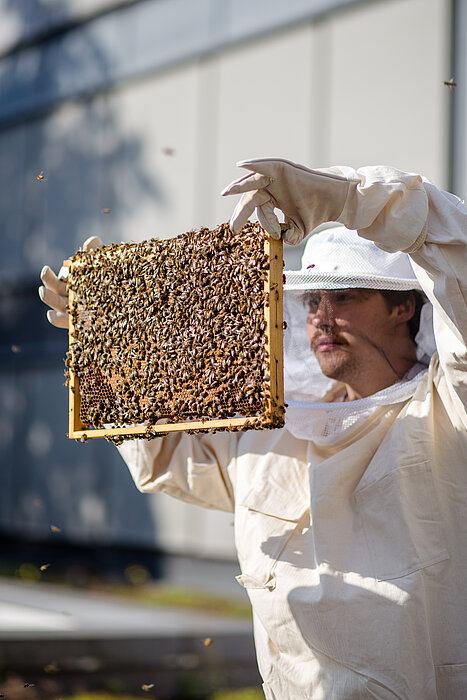 Nicht nur die Studierenden sind fleißig an der HTWK Leipzig: Seit Mitte Juni lebt auf dem Campus ein Bienenvolk. Betriebswirtschafts-Student Simon Hauser kümmert sich darum.