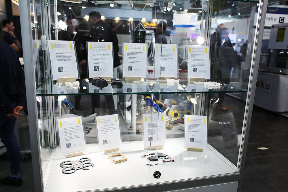 Von der Arbeitsgruppe Hybride und Generative Fertigungstechnologien sind additiv hergestellte Schalldämpfer für zivile Anwendungen und eine 3D-gedruckte poröse Struktur für Zellwachstumsstudien ausgestellt. Diese sind Ergebnisse aus Projekten, in denen es um neuartige additive Leitungs- und Gehäusebauteile mit immanenten Schalldämpfungs- und Schalldämmungsstrukturen geht sowie um Design und Biofunktionalisierung von Cloud Sponge-inspirierten Scaffolds für eine verbesserte Leistung von Knochenzellen.